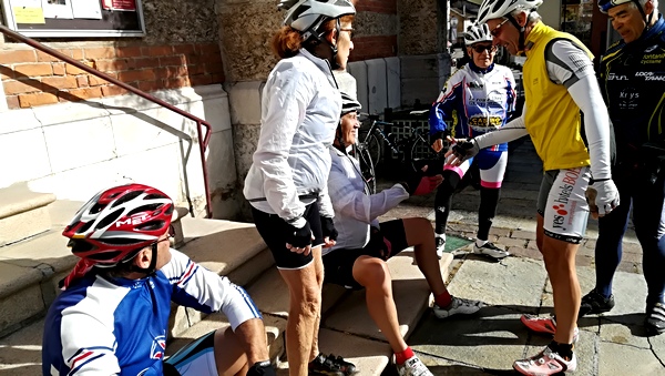 Une seule femme, Jacquotte, très bonne grimpeuse, parmi une douzaine de copains, que je cataloguerais comme les plus costaux de la roue libre. Je n'en menais pas large, vu que cette p de Bronchite m'avait privé de vélo durant 5 semaines ! Bof ! J'avais beau leur dire de ne pas m'attendre, gentils comme tout, ils m'attendaient aux sommets des côtes pas piquées des vers !