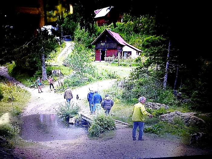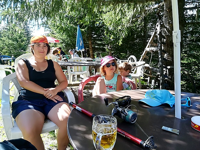 Après 100 m de descente, les chaussures un peu trop justes, prêtées par mon fils, me faisaient un mal fou aux pouces de mes pieds ! Sélim se déchaussa pour que j'essaye les siennes, impeccable ! Mais à ma grande surprise, au lieu d'enfiler les chaussures de son père, il les attacha autour de son cou et fit toute la descente pieds nus ! Nous primes tous deux une certaine avance, car Léa, fatiguée, descendait très lentement. A dix minutes de la buvette au bas de la descente, Sélim me proposa de les attendre là bas, tandis qu'il pénétrait, toujours pieds nus, dans un bois à la recherche de champignons. Lorsqu'ils me rejoignirent à la buvette, (photo ci-dessus) Sélim avait dans un sac 6 magnifiques cèpes !