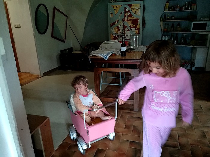 C'est le lendemain, sans la moindre fatigue que je disais aurevoir à mes enfants, avec une certaine peine cachée au fond de mon vieux coeur de pépé. J'ai pris cette dernière photo où la petite Léa joue à la maman avec son petit frère....